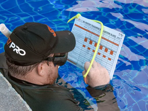 - Conducting confined water sessions, including giving effective briefings, managing student performance, providing in-water support, and debriefing after each exercise.